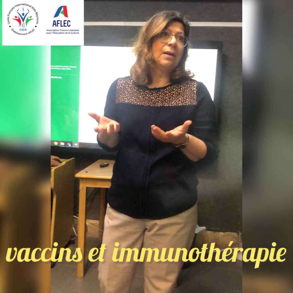 Le Dr Soulaima Chamat, éminente professeure d’immunologie à la faculté des sciences médicales de l’Université Libanaise et membre de l’AFLEC a illuminé notre lycée de son savoir. Sa présentation captivante aux élèves des classes de 1ère et 3ème